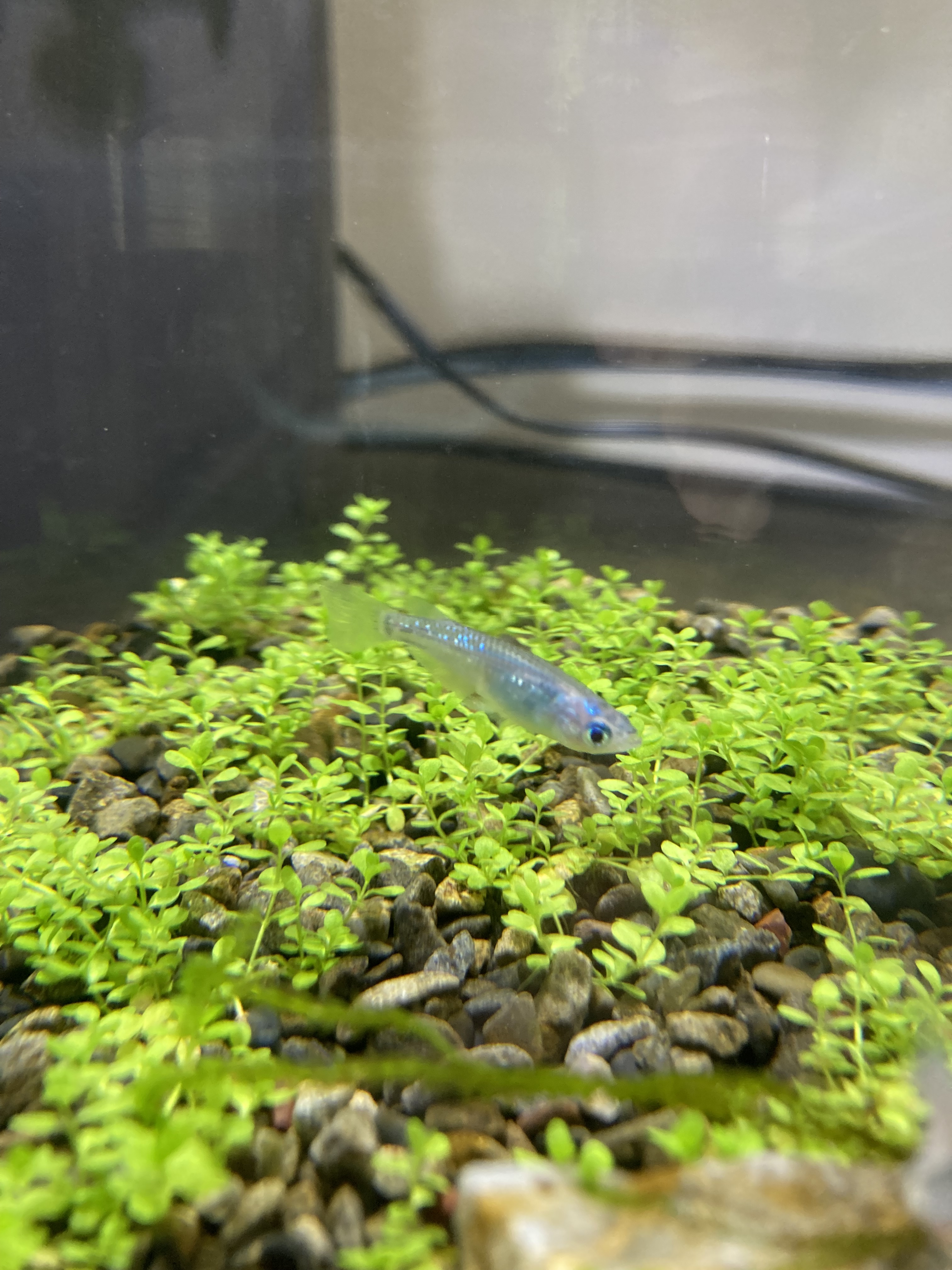注水してサファイアメダカ3匹を迎え入れた。きちんと根が張っていたようで、注水後に浮いてきた水草は一本も無かった(黄色くなって浮いてきてしまった葉はあったが)。時間は掛かったし水草育成に最適な環境では無かったと思うが、満足できる状態にはなったかなと思っている。